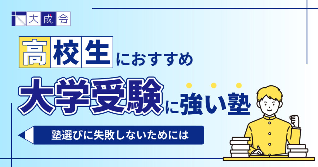 「大学受験するなら、学習塾は必要?」 「みんな、いつごろから大学受験塾に行くの?」 「大学受験の塾は、何を基準に選べばいい?」 大学受験を視野に入れた学習塾選びには、押さえるべきポイントがあります。 そこでこの記事では、大学受験におすすめの... -